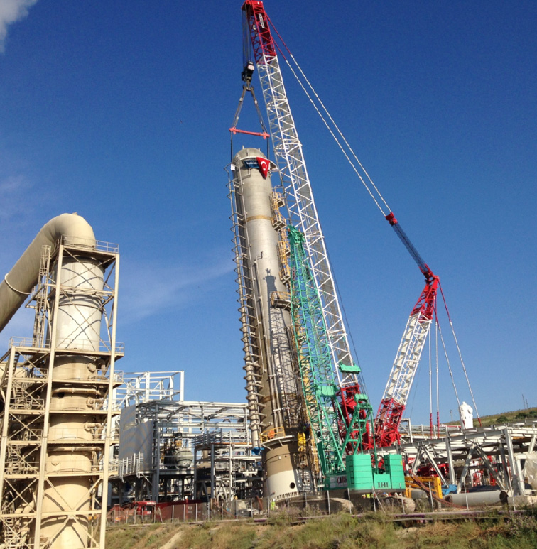 MTG koos Caba om een absorptietoren van 230 ton met een lengte van 49 meter op te hijsen. De operatie duurde 12 uur, van 10.00 tot 24.00 uur. De hoofdkraan, een Liebherr LR 1750, model 2013, is uitgerust met een hoofdgiek van 70 mt, een derrickgiek van 31,5 mt en een superlift-ballasthulpstuk van 150 ton. De sleepkraan is een 250t kraan, model 2013 IHI CC 2500-6. Onder de rups worden 30 eenheden van 5m x 1m baggermatten gebruikt.